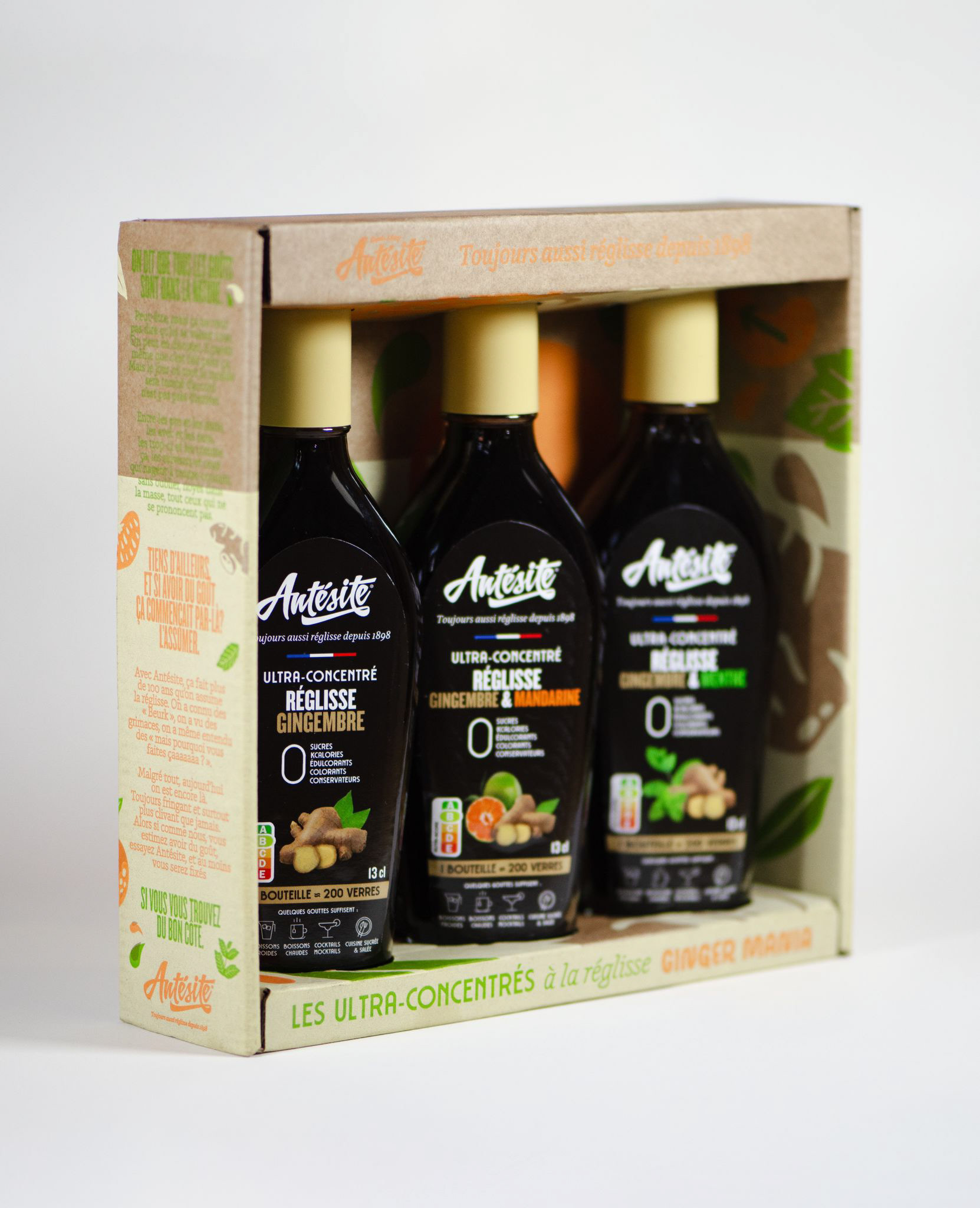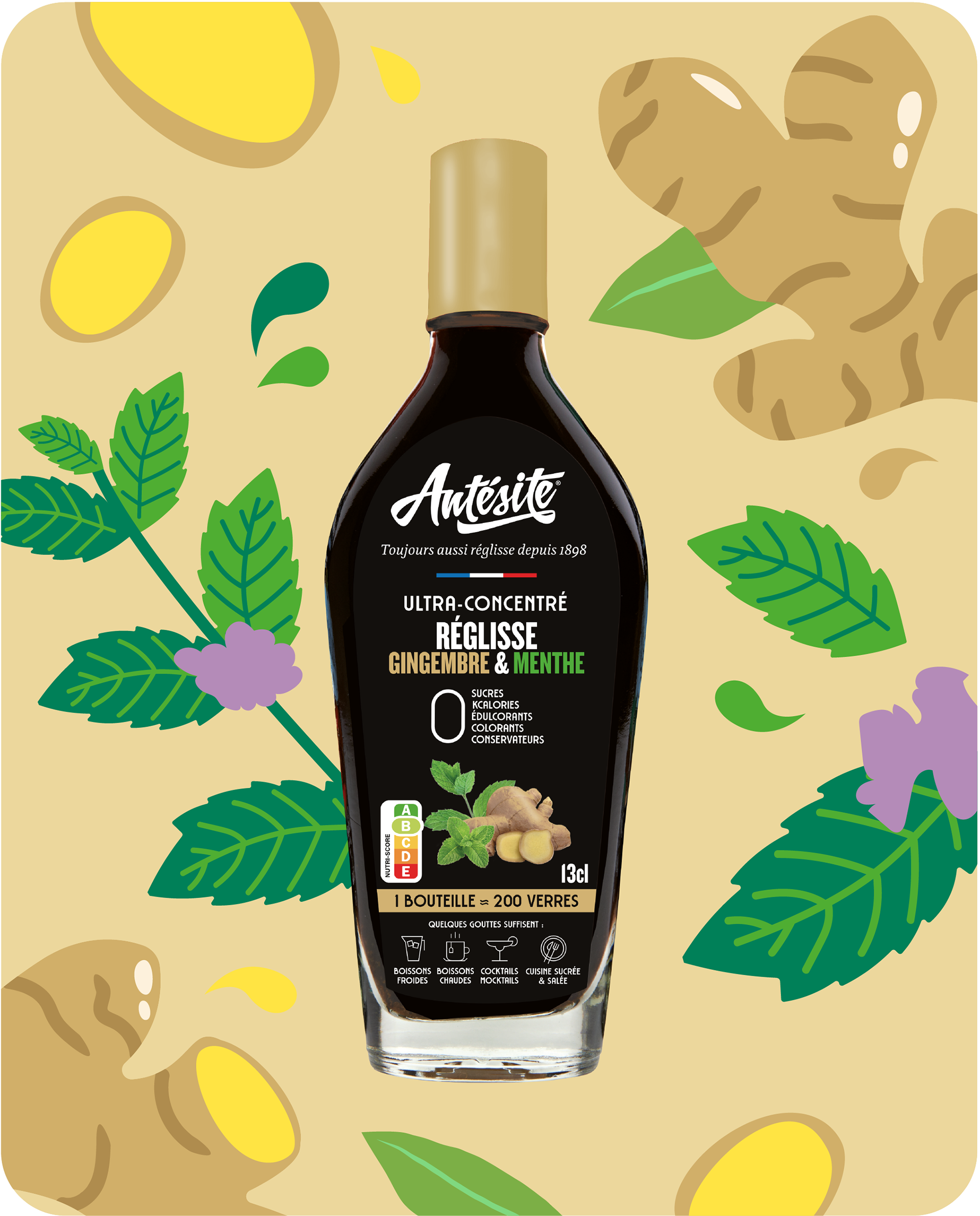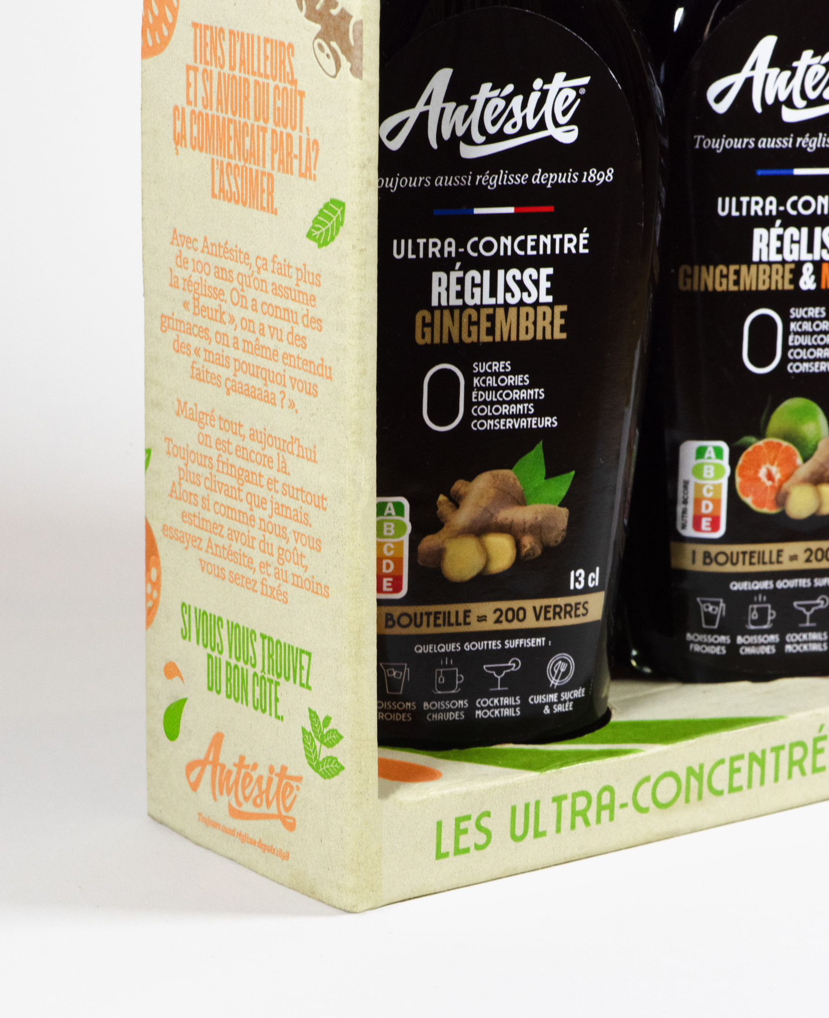 Création du packaging et des étiquettes bouteilles, pour la nouvelle gamme Antésite au gingembre.