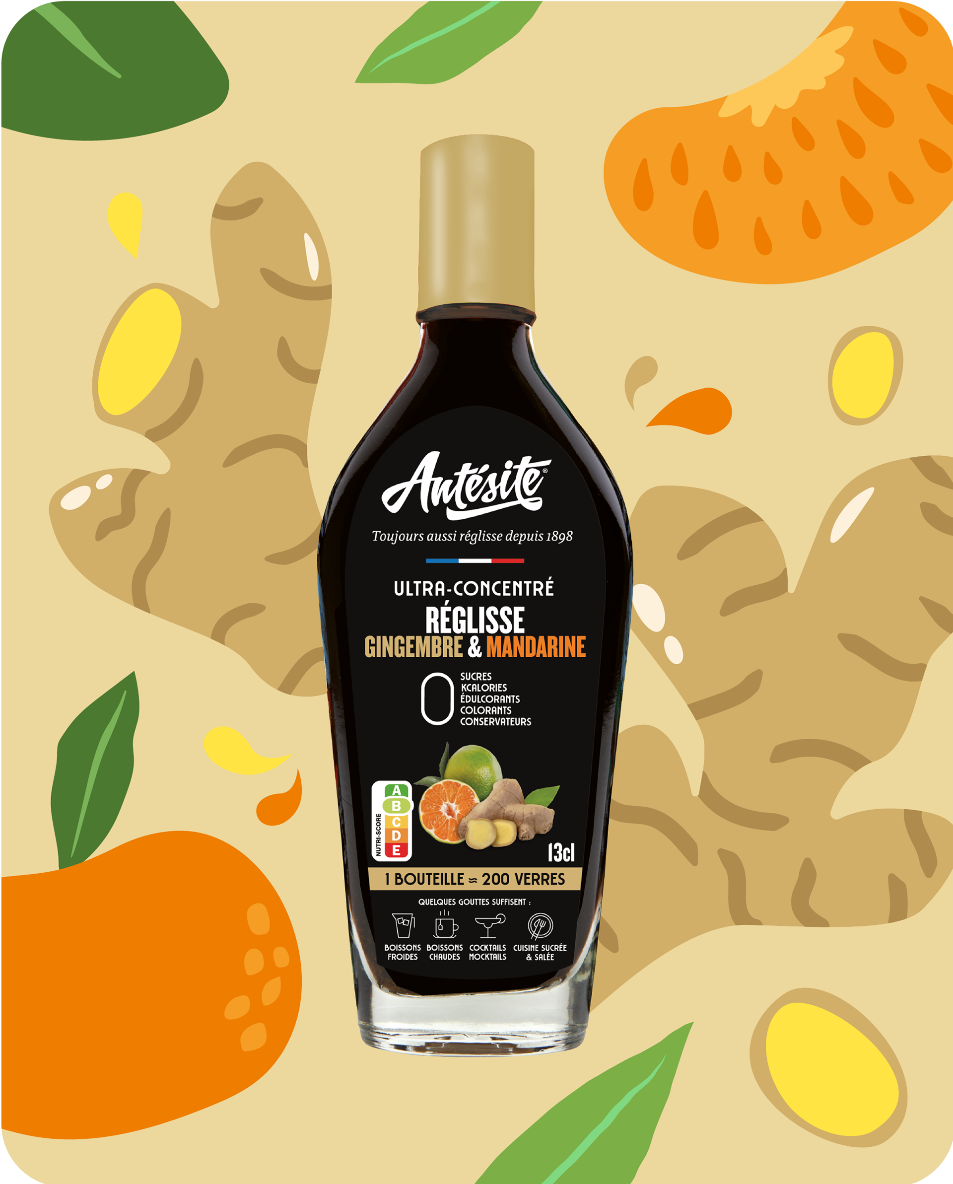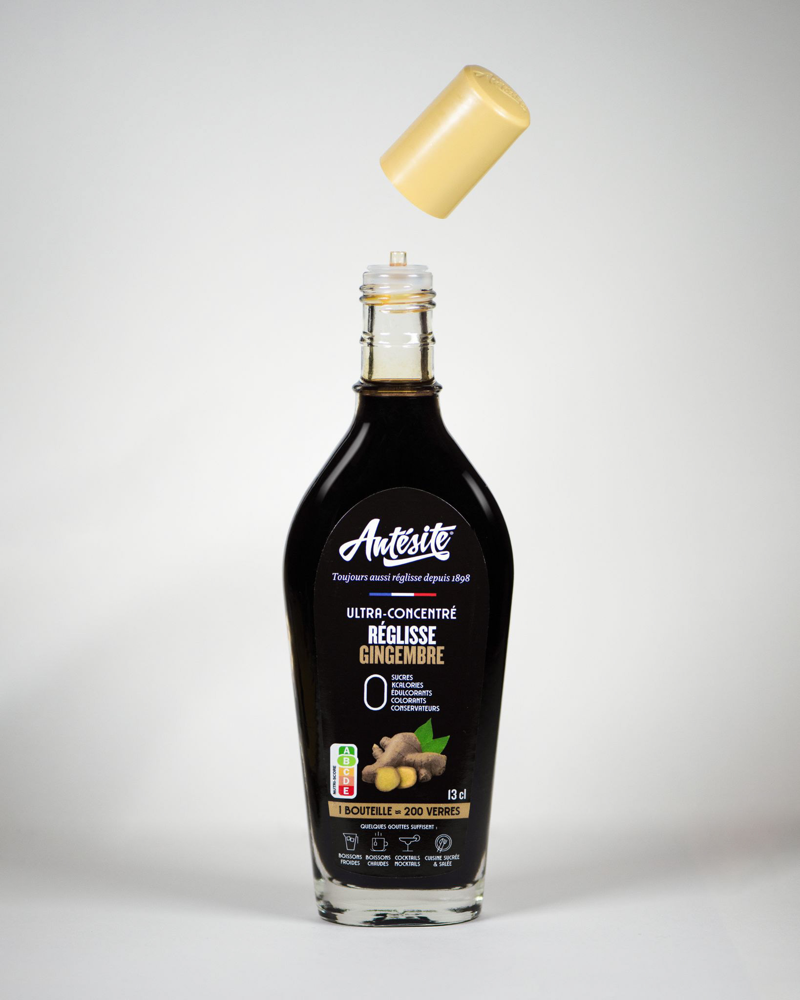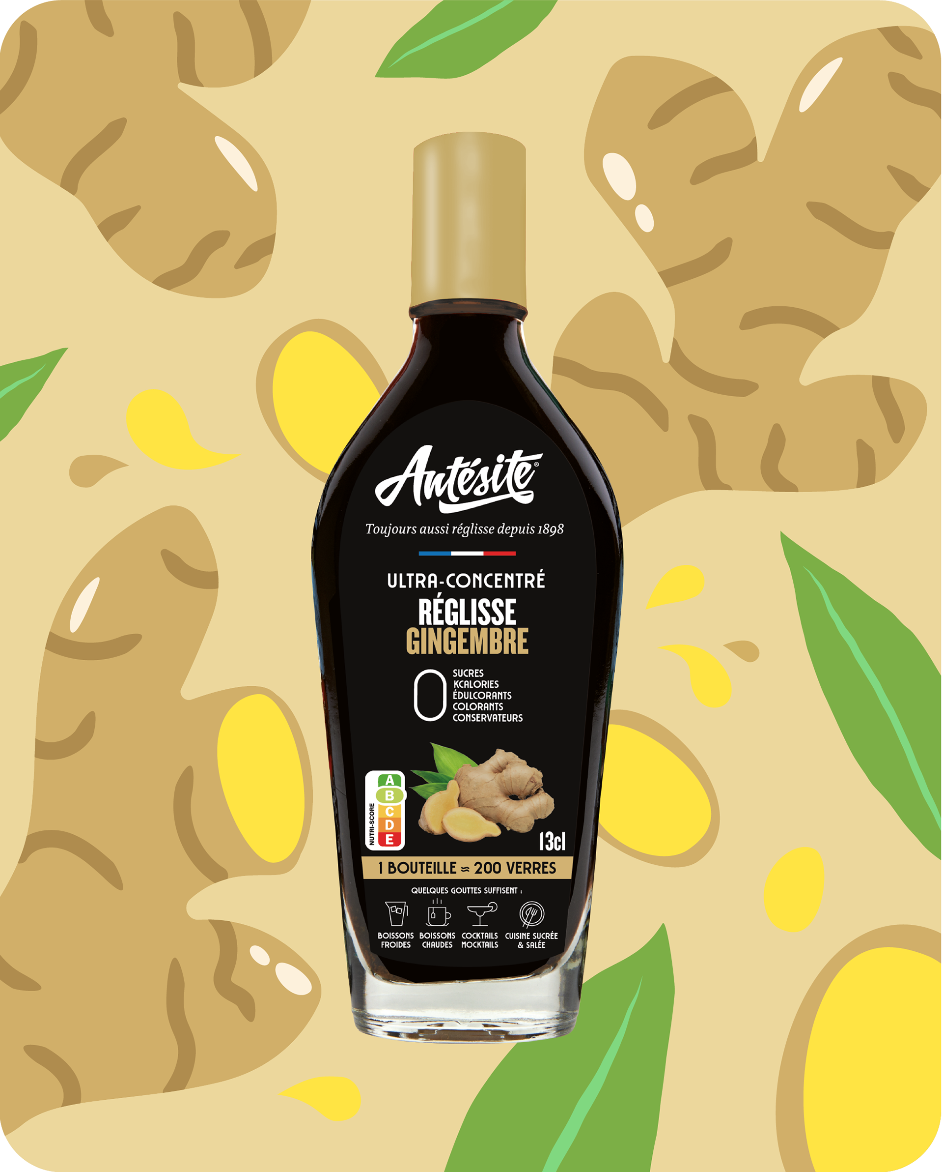 Création du packaging et des étiquettes bouteilles, pour la nouvelle gamme Antésite au gingembre.